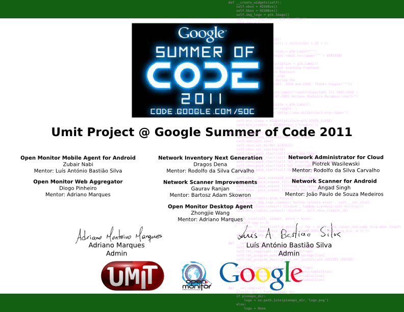 The other special thing about these certificates is that they feature real code that is present in our repositories since 2005 and that all of those being honored have gone through at least once in their life with Umit Project. It is also part of the About of the Umit Network Scanner and one of the places where we keep our permanent honors to all of those who helped our community.