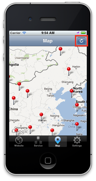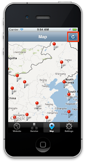 Tap on the "Refresh" button, the app will fetch the events from the aggregator, and show it on the map.